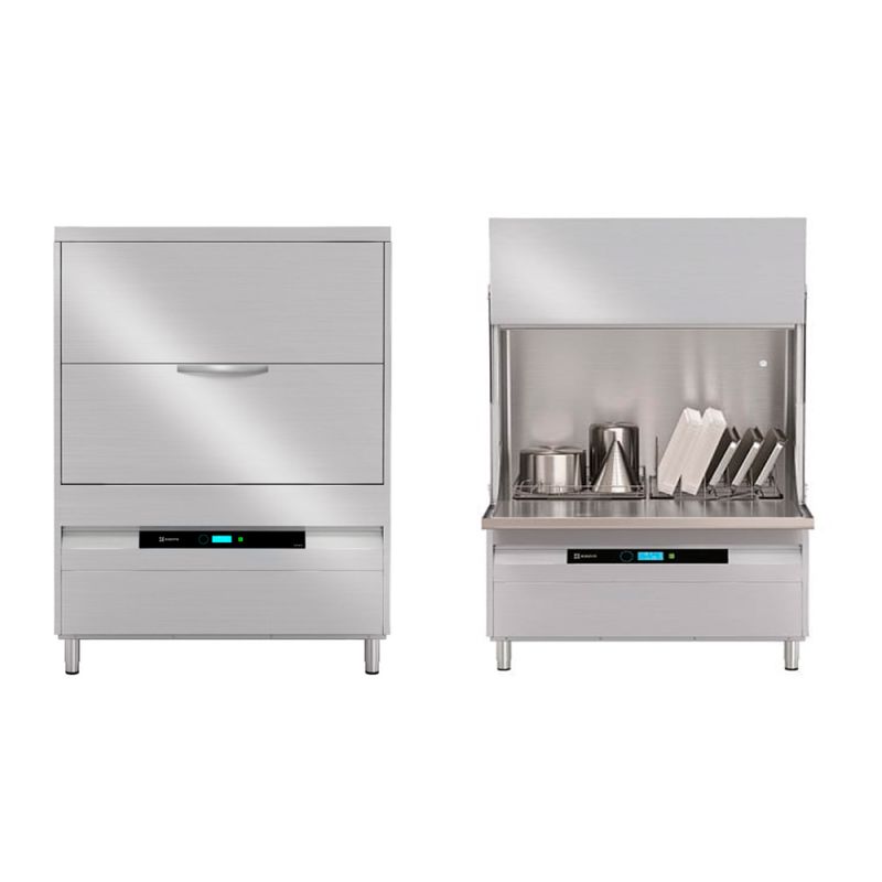 Електронна панель дозволяє управляти різними параметрами, щоб забезпечити максимальну персоналізацію, а безперервна самодіагностика дозволяє звести до мінімуму простої машини, пропонуючи деякі операції для перевірки. Цикл самоочищення в кінці дня дозволяє очищати ванну і зливати гарячу воду з бойлера, запобігаючи утворенню всередині нього вапняного нальоту. Перистальтичний електричний подвійний дозатор миючого і обполіскуючого засобів в серійній комплектації забезпечує максимальний результат кожного циклу мийки з великою економією завдяки точному дозуванню, керованому електронною панеллю, тоді як штамповані миючі та ополіскуючі рукава гарантують надійну роботу і довгий термін служби. Функція Termostop (Термостоп) стежить за тим, щоб мийка та ополіскування починалися тільки після досягнення необхідної температури. Корпус повністю виконаний з нержавіючої сталі AISI 304 і розроблений так, що всі компоненти розташовані в передній частині машини, щоб забезпечити просте техобслуговування з боку технічного фахівця. Міцні та надійні посудомийні машини, покликані зробити ваш день зручніше.
