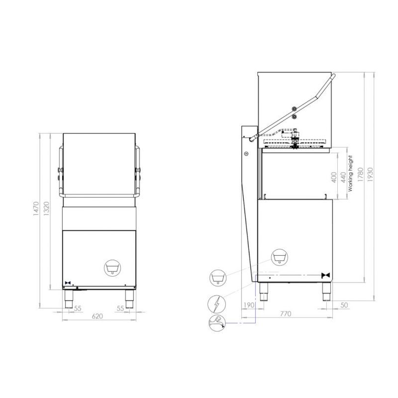 Штампована ванна із заокругленим дном і інтегрованими фільтрами забезпечує максимальну гігієну і простоту очищення, а знімний тримач кошика спрощує обслуговування. Вбудована система самодіагностики своєчасно повідомляє про можливі збої, скорочуючи час простоїв, а подвійний перистальтичний дозатор гарантує точну подачу миючих і ополіскуючих засобів на кожному циклі. Корпус виготовлений з міцної нержавіючої сталі AISI 304, стійкої до корозії і механічних впливів, а доступ до всіх компонентів здійснюється спереду, що значно полегшує технічне обслуговування.