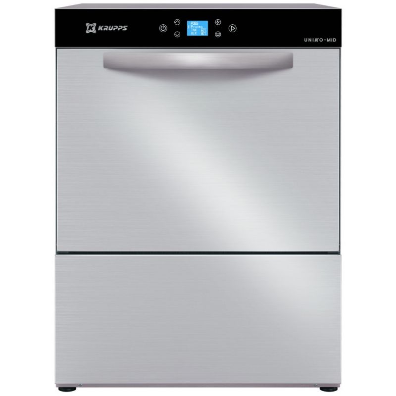 Фронтальна посудомийна машина Krupps K580E, 40/30/24/20 корз./год, цикл 90/120/150/180 сек., Касета 500х500х100мм, посуд до d=330мм, електр. упр., 2 дозатора: мийний/смужковий., 585х680х815мм, 5,02 кВт, 380ВХарактеристики